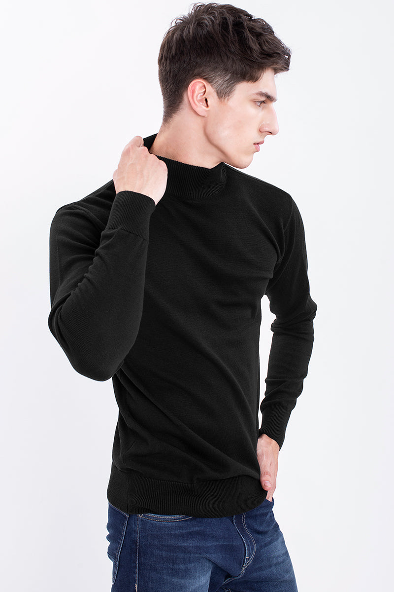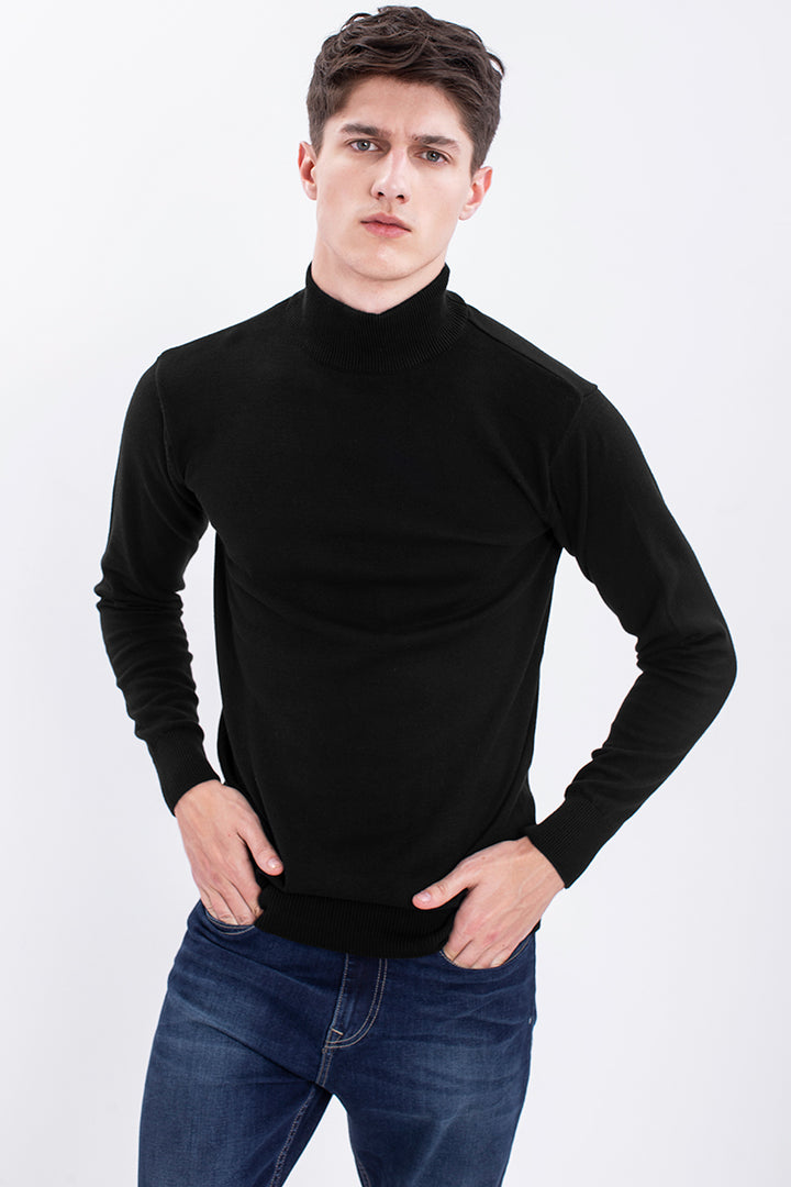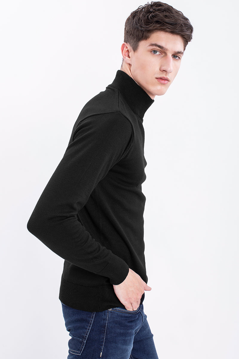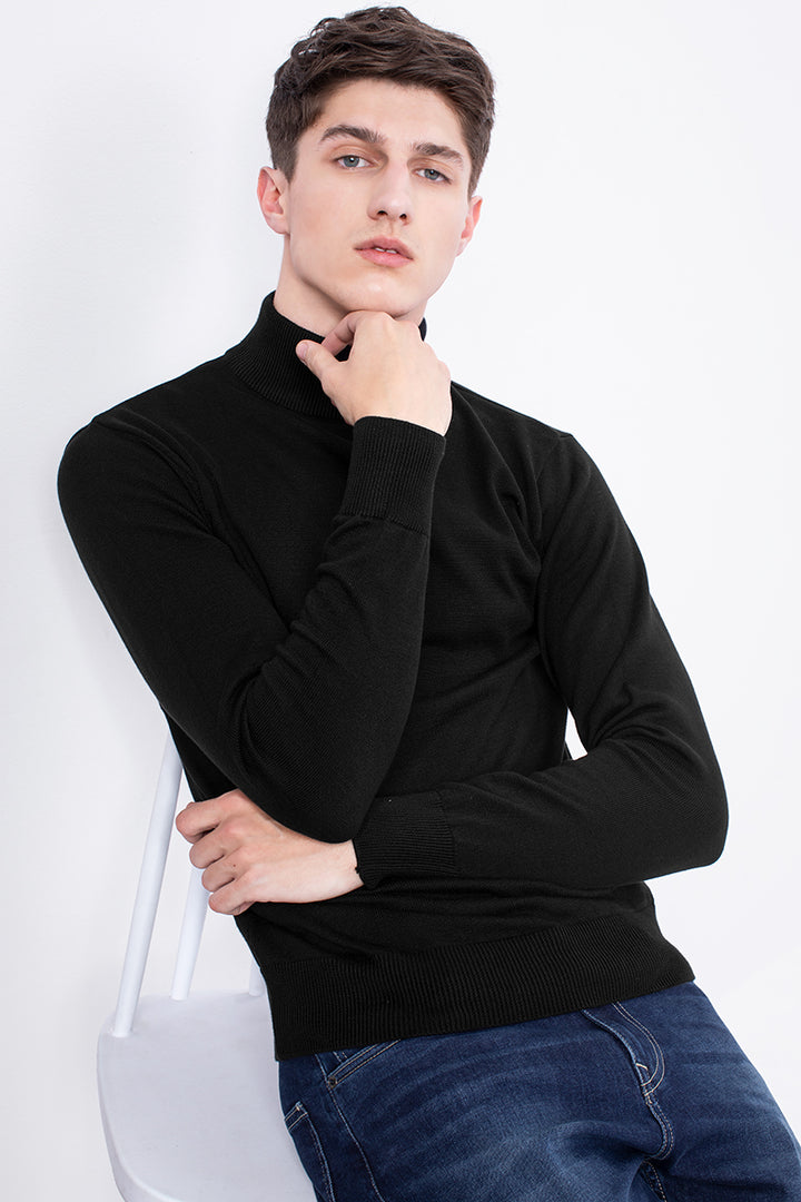 Black Solid Rib-Knit Turtle Neck Sweater - SNITCH